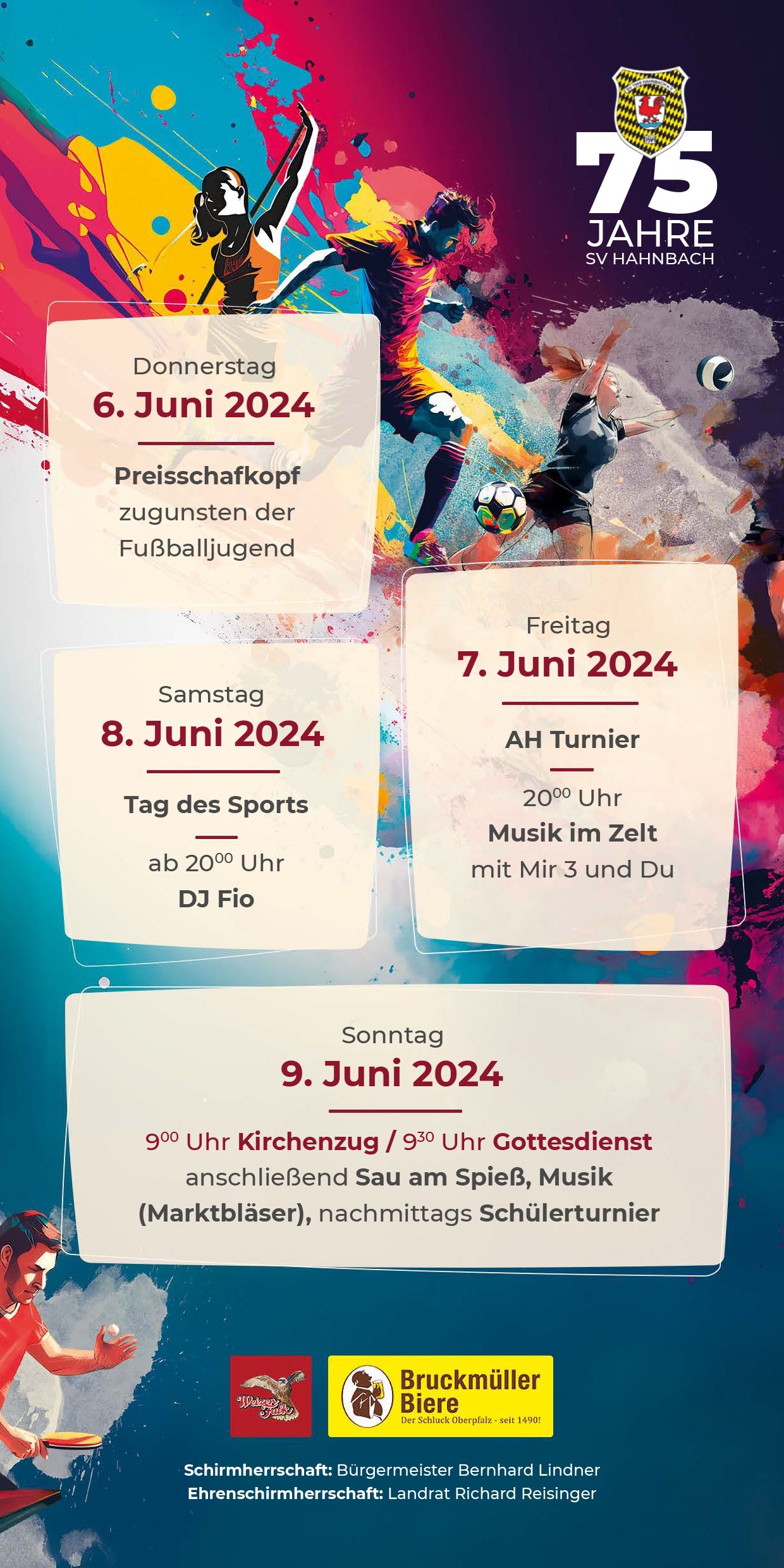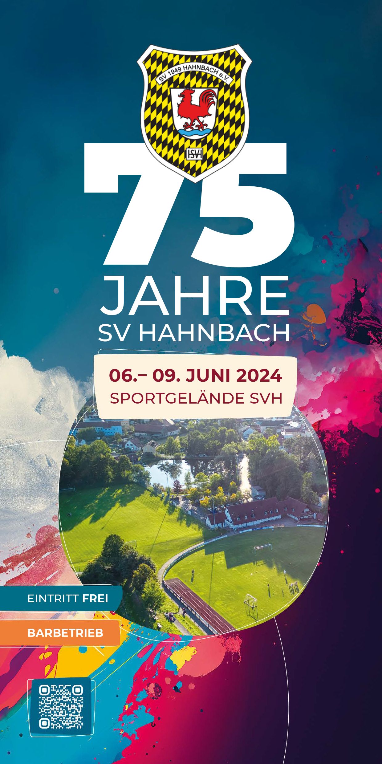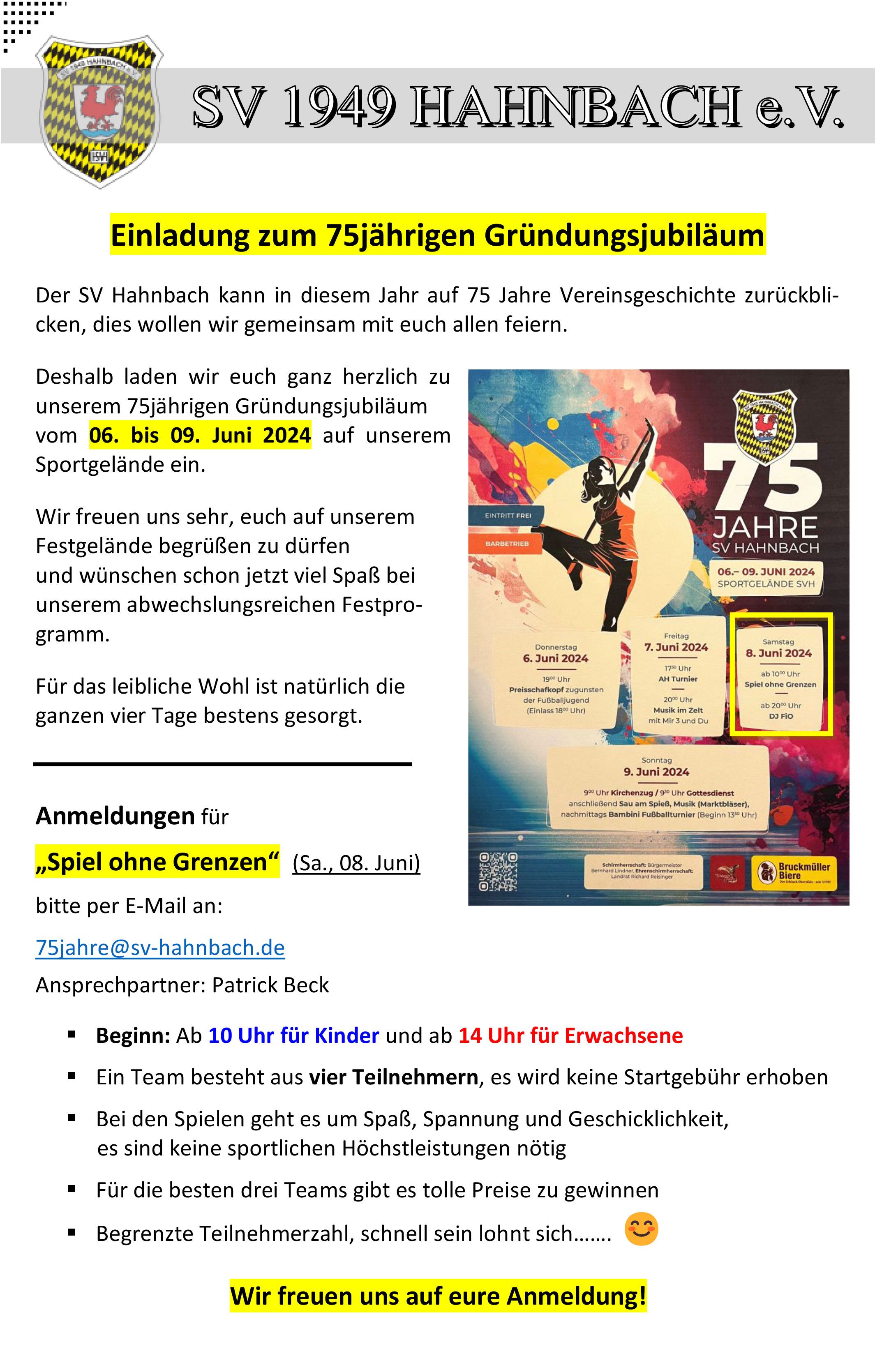 Vom 06. - 09. Juni 2024 feiert der Sportverein 1949 Hahnbach e.V. sein 75 Jähriges Vereinsjubiläum. Veranstaltungsort ist das Sportgelände in Hahnbach (Josef Trösch Sportanlage).
