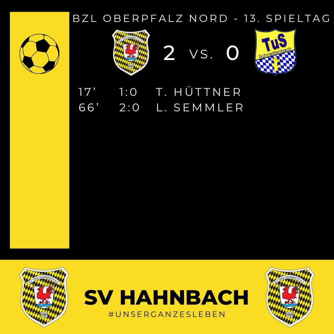 Am 13. Spieltag hatten Trainer Ilker Caliskan und seine Mannschaft den TuS Schnaittenbach um die beiden Spielertrainer Ralph Egeter und Stefan Meisel zu Gast. Der Tabellenletzte kam etwas besser in die Partie und damit auch zu den ersten Offensivaktionen. Danach versuchte die Heimelf, die Kontrolle über das Spiel zu bekommen. Der 1:0-Führungstreffer resultierte aus einem Angriff über die linke Seite, bei dem sich Ludwig Semmler energisch durchsetzte und den Ball in den Strafraum brachte, wo sich Tobias Hüttner gegen zwei Gegenspieler behaupten konnte und den Ball sehenswert aus etwa 15 Metern im Tor unterbrachte. Generell war man im ersten Durchgang im Passspiel und der Rückwärtsbewegung ein wenig nachlässiger als gewohnt. Druckvoller und souveräner wurde es in Halbzeit zwei. Das 2:0 war zum Greifen nah, als Manuel Plach einen Freistoß aus 18 Metern an den Innenpfosten setzte - auch der Nachschuss von Tobias Hüttner verfehlte sein Ziel. Ludwig Semmler war es letztendlich, der nach einem Pass von Johannes Dotzler am Ball blieb und mit einem platzierten Schuss aus 20 Metern das 2:0 erzielte. Zwar erspielte sich der SVH weitere Torchancen, letztlich blieb es jedoch beim 2:0. Kurz vor Abpfiff entschärfte Tino Bohmann noch eine Doppelchance der Gäste.