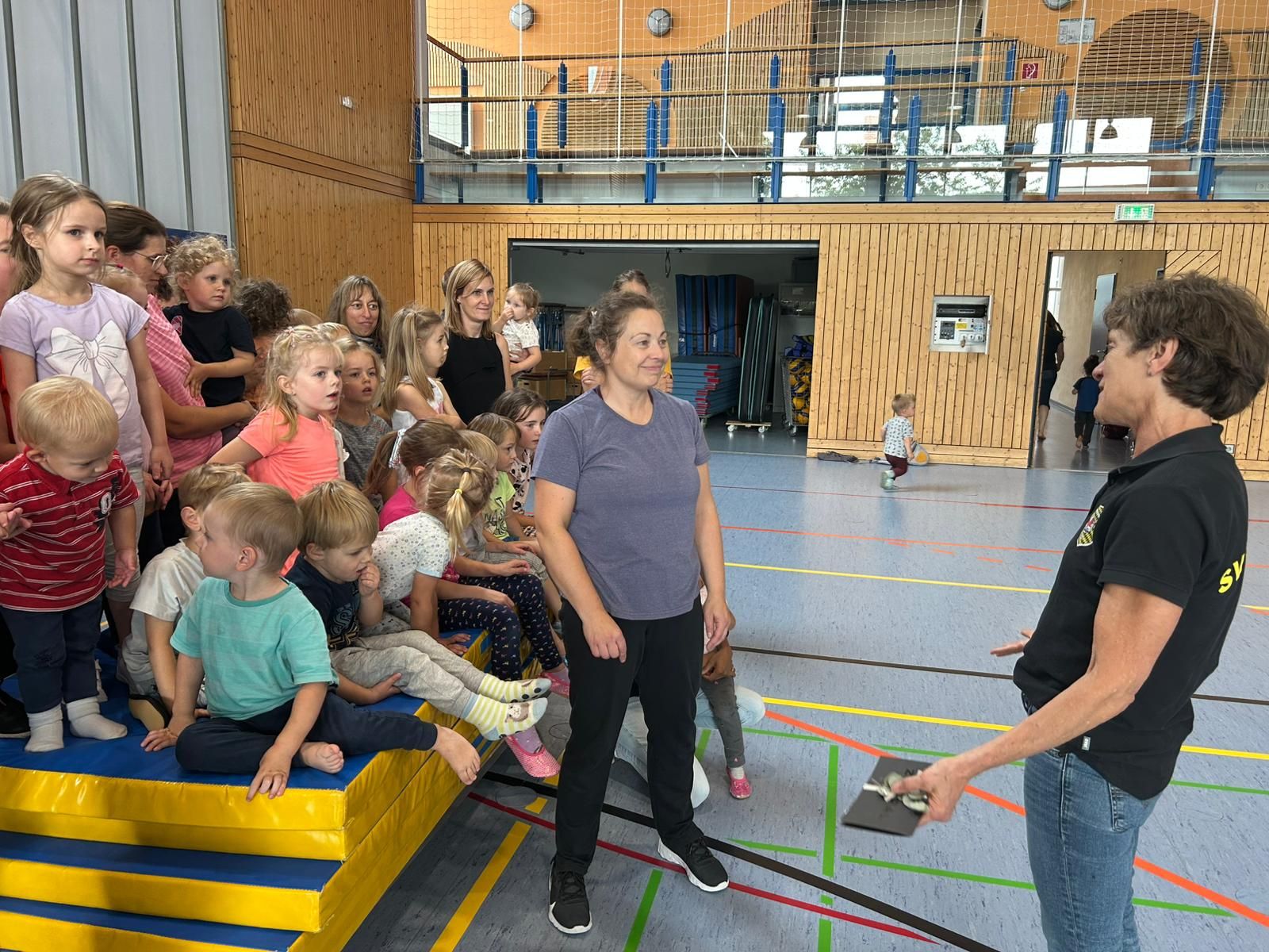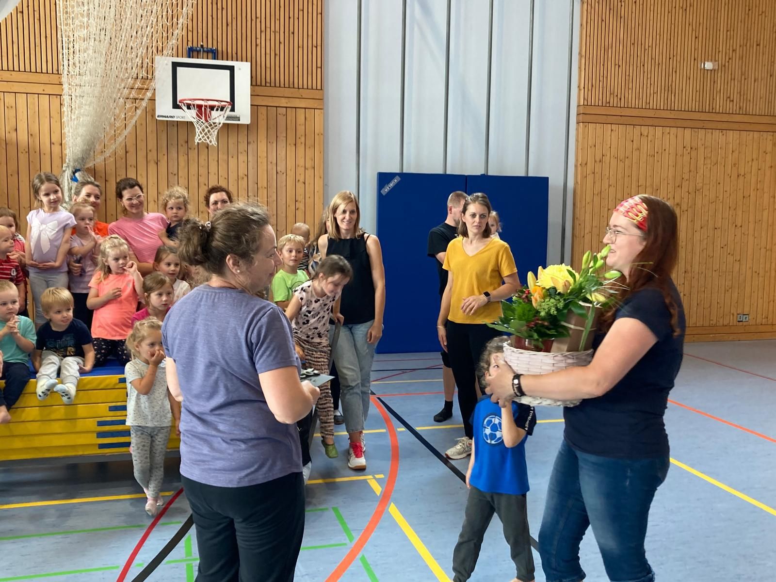 Als Silvia vor 20 Jahren mit dem Mutter- und Kindturnen begann, hätte sie niemals daran gedacht, dass sie es so lange leiten würde. Unzählige Kleinkinder mit ihren Eltern und zum Teil auch begleitet von den Großeltern durften unter ihrer Leitung variantenreiche Parkours und Bewegungsübungen mit ganz viel Spaß absolvieren. Dazu nahm sie sich immer wieder die Zeit, neue Anregungen und Verbesserungen aus den zahlreich besuchten Übungsleiterlehrgängen einzubauen. „Es hat unheimlich viel Spaß gemacht, für euch all die Jahre da zu sein, aber jetzt ist es an der Zeit, das Zepter an Jüngere abzugeben“, sagt sie zum Abschluss ihrer letzten Übungsstunde. Als Dankeschön bekam sie von der großen anwesenden Kinder- und Elternschar ein blumiges Potpourri.